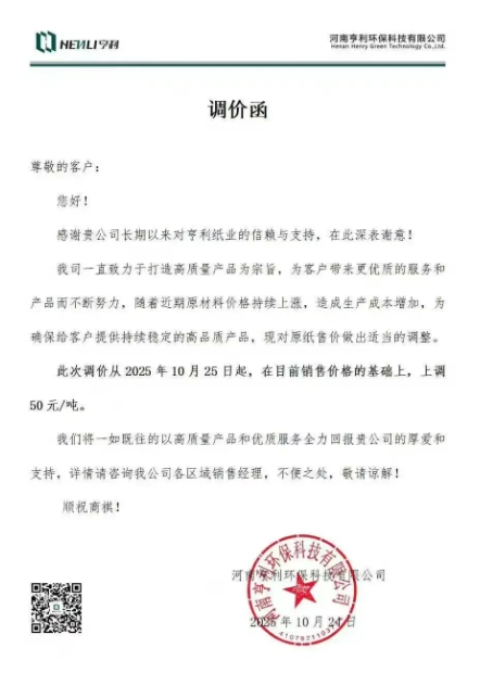 • 江蘇玖森紙業(yè) 自10月25日起,對(duì)我司生產(chǎn)的所有定量高強(qiáng)瓦楞紙進(jìn)行階段提價(jià),在現(xiàn)基礎(chǔ)上漲價(jià) 50 元/噸。