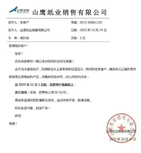 • 山鷹浙江基地 自11月1日起,在原有價(jià)格基礎(chǔ)上: 浙江基地:金桂、四季桂上調(diào) 50 元/噸。