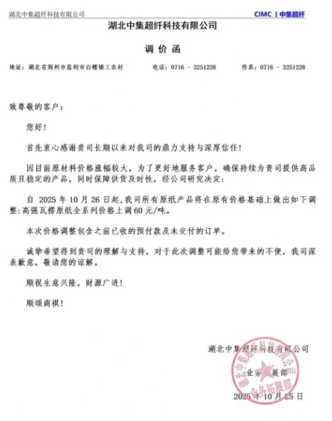 • 湖北中集超纖科技有限公司 自10月26日起,我司所有原紙產(chǎn)品將在原有價(jià)格基礎(chǔ)上做出如下調(diào)整:高強(qiáng)瓦楞原紙全系列價(jià)格上調(diào)60元/噸。