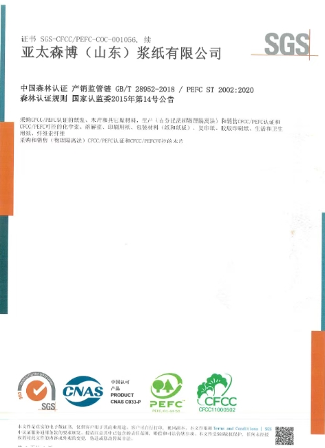 11月19日,亞太森博(山東)漿紙有限公司順利通過了CFCC(中國森林認證)/PEFC(森林認證體系認可計劃)產銷監管鏈(COC)審核,這證明我公司在可持續林業產品貿易和負責任采購方面的管理體系持續有效運行,并為公司的市場競爭力與綠色品牌形象提供了有力保障。此次審核由通標標準技術服務有限公司(SGS)負責。