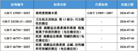 近日,國家市場監(jiān)督管理總局(國家標(biāo)準(zhǔn)化管理委員會)發(fā)布關(guān)于批準(zhǔn)發(fā)布261項(xiàng)推薦性國家標(biāo)準(zhǔn)公告,其中包括《衛(wèi)生紙及其制品 第13部分:可分散性的測定》《紙漿 硫酸鹽法蒸煮液和黑液 硫氫根離子濃度的測定(電位滴定法)》等5項(xiàng)造紙領(lǐng)域國家標(biāo)準(zhǔn)。