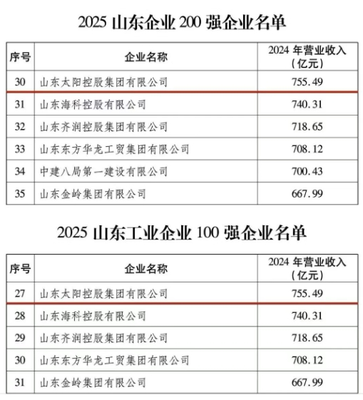 12月16日,山東省企業聯合會、山東省企業家協會聯合發布了《2025山東大企業發展研究報告》和2025山東企業200強、工業企業100強和服務業企業50強名單。其中,公司控股股東山東太陽控股集團有限公司位列2025山東企業200強第30位,2025山東工業企業100強第27位。