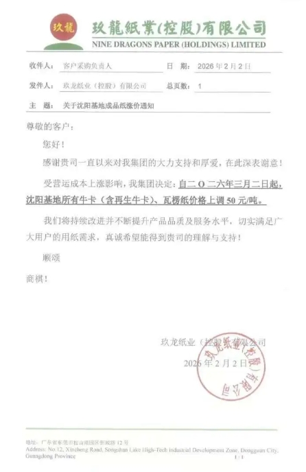 自三月二日起,沈陽基地所有牛卡(含再生牛卡)、瓦楞紙價格上調 50元/噸。