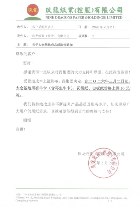 自三月二日起,太倉基地所有牛卡(含再生牛卡)、瓦楞紙、白板紙價格上調50元/噸。