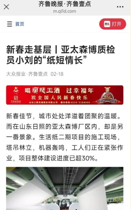 春節(jié)假期,在亞太森博(山東)漿紙有限公司制漿、紙板、文化紙、生活紙、萊賽爾等各條生產(chǎn)線上,生產(chǎn)設(shè)備均開足馬力滿負(fù)荷運(yùn)轉(zhuǎn)。企業(yè)員工堅(jiān)守崗位,在保證安全的前提下,保質(zhì)保量完成公司下達(dá)的生產(chǎn)任務(wù),用奮斗實(shí)干開啟馬年新氣象,奮力奪取一季度“開門紅”。 齊魯晚報(bào)·齊魯壹點(diǎn) 鳳凰新聞 日照開發(fā)區(qū)發(fā)布 春節(jié)我在崗丨亞太森博文化紙技術(shù)部劉文艷的“紙短情長(zhǎng)” 新年喜氣未消,城市處處洋溢著團(tuán)聚的溫暖。而在日照經(jīng)開區(qū)亞太森博(山東)漿紙有限公司廠區(qū)內(nèi),卻是另一番火熱景象——文化紙生產(chǎn)線正開足馬力全速運(yùn)轉(zhuǎn),機(jī)器轟鳴聲此起彼伏,一卷卷寬8.7米、重達(dá)60噸的巨型紙卷源源不斷地從生產(chǎn)線下線。由于訂單已排至四月份,這個(gè)春節(jié),生產(chǎn)線一刻不停。 文化紙技術(shù)部品質(zhì)主管劉文艷快步穿過紙機(jī)區(qū)域,對(duì)新鮮出爐的紙卷進(jìn)行質(zhì)檢取樣。自2008年踏入這一行,十五年間,紙張質(zhì)量守護(hù)始終是劉文艷職業(yè)生涯的核心。2023年亞太森博50萬噸文化紙項(xiàng)目投產(chǎn)后,她從亞太森博廣東公司北上支援,來到山東公司工作。今年春節(jié)她仍如往常,與同事們一起堅(jiān)守在生產(chǎn)一線。