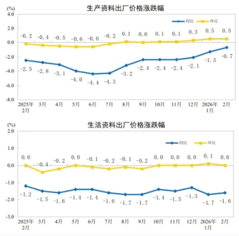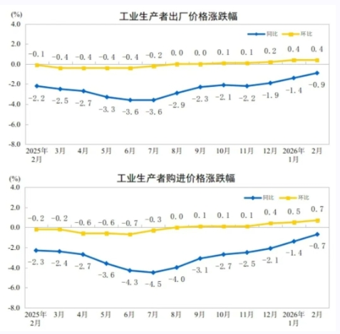 近日,國家統計局發布2026年1-2月份工業生產者出廠價格數據情況。2026年2月份,全國工業生產者出廠價格同比下降0.9%,降幅比上月收窄0.5個百分點;環比上漲0.4%,漲幅與上月相同。