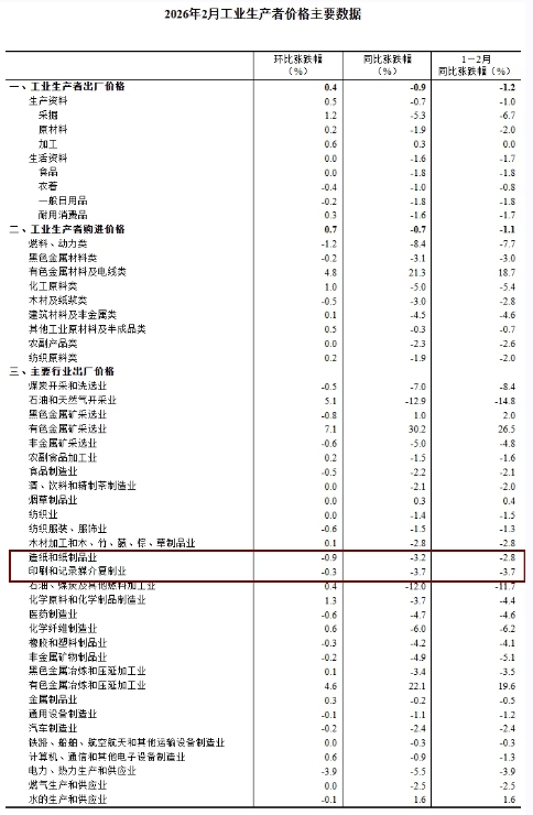 值得關注的是,2026年1-2月份印刷和記錄媒介復制業工業生產者出廠價格同比下降3.7%;造紙和紙制品業工業生產者出廠價格同比下降2.8%。