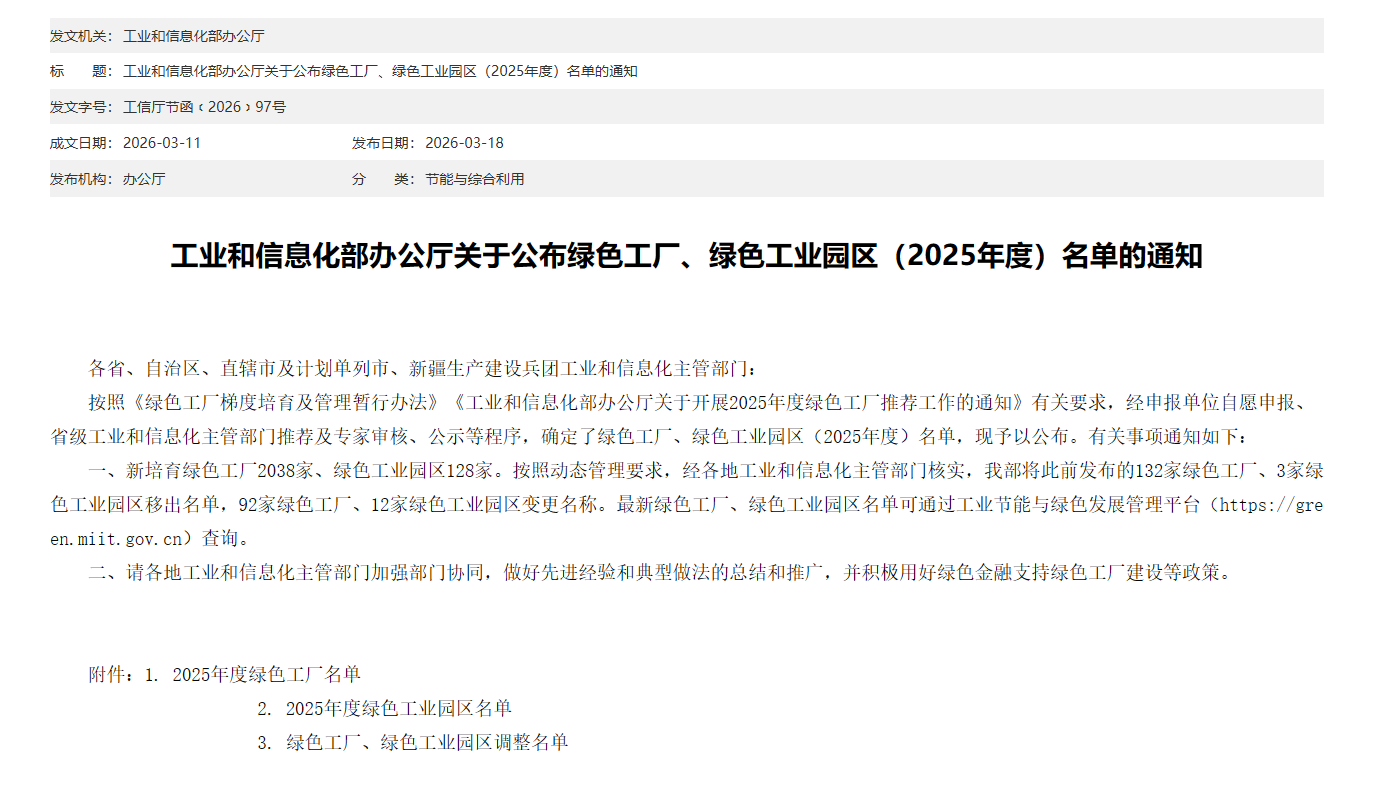近日,工業和信息化部辦公廳公布2025年度綠色工廠、綠色工業園區名單。