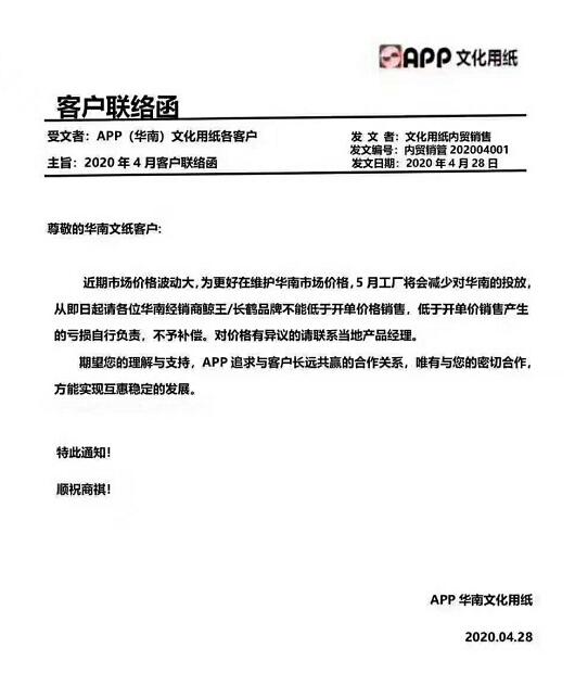 APP華南文化用紙2020年4月28日發布客戶聯絡函。近期市場價格波動大,為更好維護華南市場價格,5月工廠將會減少對華南的投放,從即日起請各位華南經銷商鯨王/長鶴品牌不能低于開單價格銷售,低于開單價格銷售產生的虧損自行負責,不予補償。對價格有異議的請聯系當地產品經理。