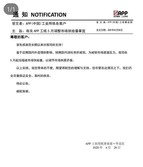 APP工業用紙事業部·華北區2020年4月28日發布通知。鑒于近期國內外疫情的影響,短期國內消化有所減弱,為減輕市場渠道壓力,我司自5月起擬縮減市場供給量,以調節市場供需矛盾。