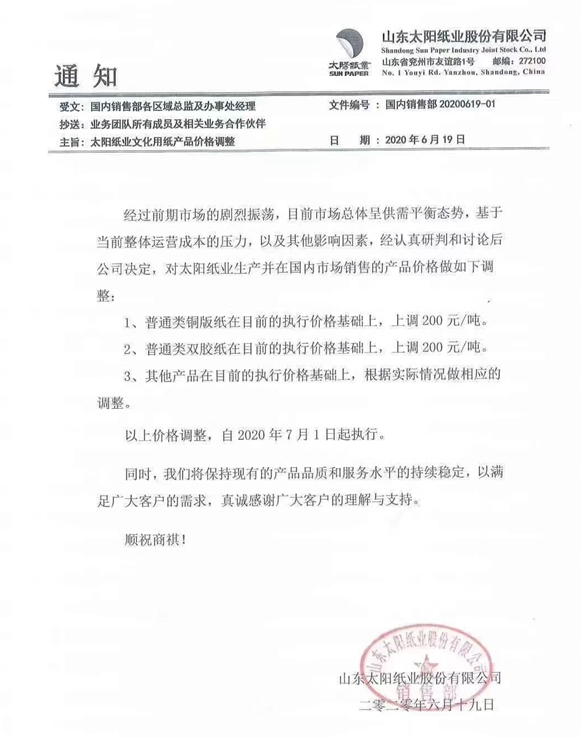 太陽紙業6月19日發布文化紙漲價函,普通類銅版紙在目前執行價格基礎上,上調200元/噸;普通類雙膠紙在目前執行價格基礎上,上調200元/噸;其他產品自目前的執行價格基礎上,根據實際情況做相應的調整。