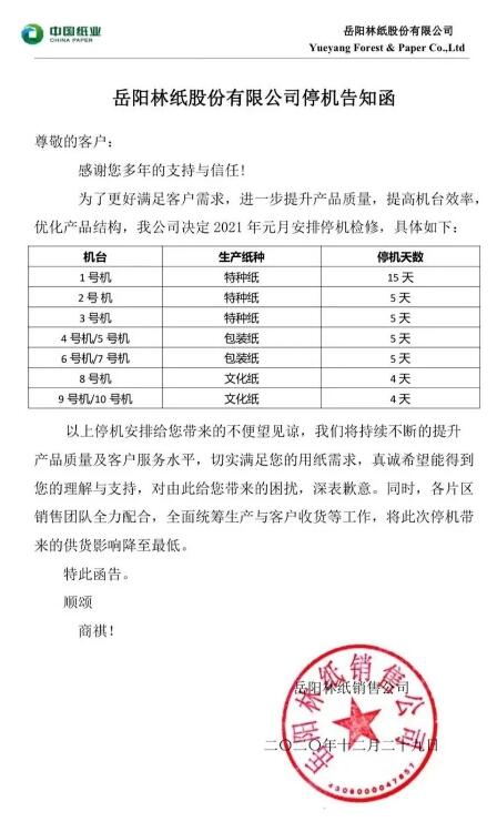 為更好滿足客戶需求,進一步提升產品質量,提高機臺效率,優化產品結構,我公司決定2021年元旦安排停機檢修。位于岳陽的全部10臺紙機計劃停機4-15天,其中六臺未涂布紙機停機時長4-15天不等,合計減產約1.4萬噸;四臺包裝紙機將分別停機5天,預計減產2,500噸牛皮紙以及其他包裝紙。