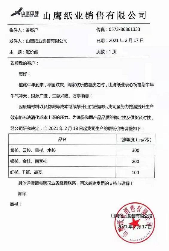 因原輔材料及物流等成本繼續攀升且供應短缺,我司雖努力挖潛提升生產效率仍無法消化成本上漲的壓力。為確保我司產品品質的穩定性及供貨及時性,經公司研究決定,自2021年2月18日起我司生產的原紙價格調整如下: