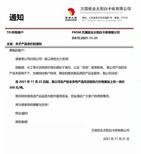 萬國紙業太陽白卡紙:自2021年11月25日起,我公司生產的全系列產品在目前執行價格基礎上統一漲價300元/噸。