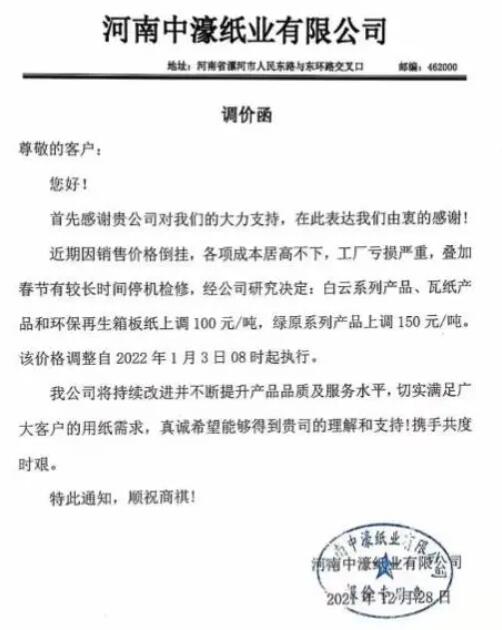 同一時間,中濠紙業(yè)還發(fā)布了調(diào)價函。近期因銷售價格倒掛,各項(xiàng)成本居高不下,工廠虧損嚴(yán)重,疊加春節(jié)有較長時間停機(jī)檢修,經(jīng)公司研究決定:白云系列產(chǎn)品、瓦紙產(chǎn)品和環(huán)保再生箱板紙上調(diào)100元/噸,綠原系列產(chǎn)品上調(diào)150元/噸。該價格調(diào)整自2022年1月3日08時起執(zhí)行。