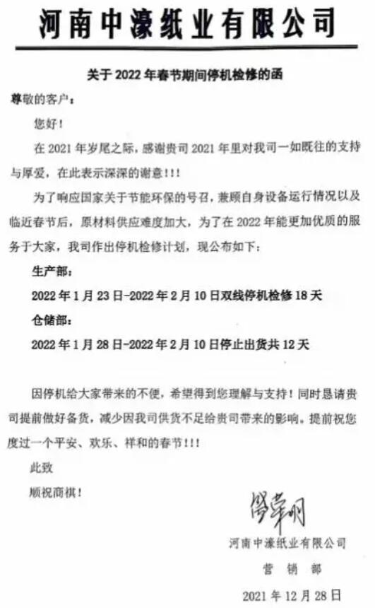 12月28日,河南中濠紙業(yè)也發(fā)布了關(guān)于2022年春節(jié)期間停機(jī)檢修的函。函稱,為了響應(yīng)國家關(guān)于節(jié)能環(huán)保的號召兼顧自身設(shè)備運(yùn)行情況以及臨近春節(jié)后,原材料供應(yīng)難度加大,為了在2022年能更加優(yōu)質(zhì)的服務(wù)于大家,公司作出如下停機(jī)檢修計(jì)劃: