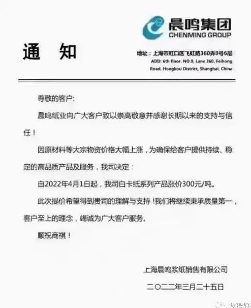 4月1日起,白卡紙系列產品漲價300元/噸。