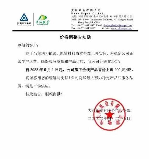 大河紙業全線產品售價上調(2022-04-27)