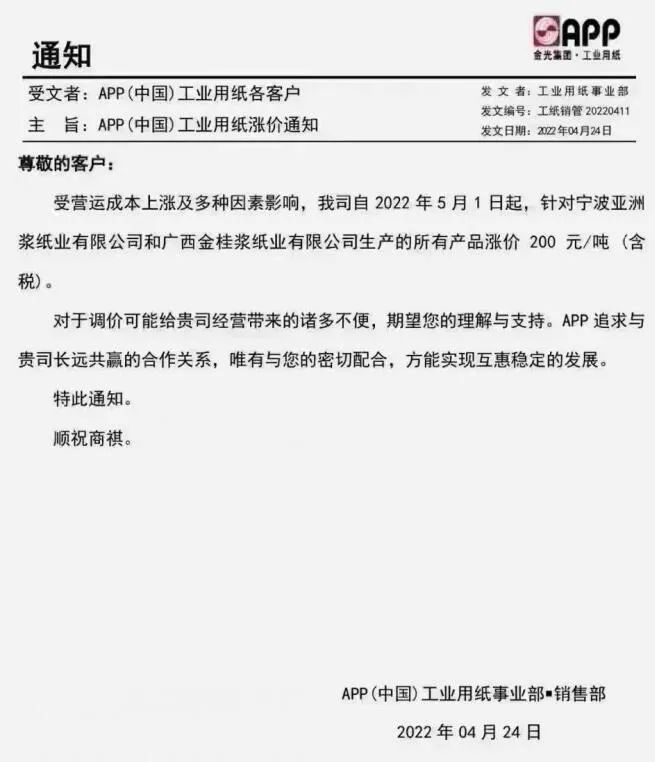 APP(中國)工業用紙:自5月1日起,針對寧波亞洲漿紙業有限公司和廣西金桂漿紙業有限公司生產的所有產品漲價200元/噸。(含稅)