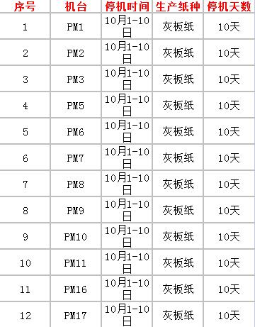金田紙業灰板紙機臺10月停機信息(2022-09-20)