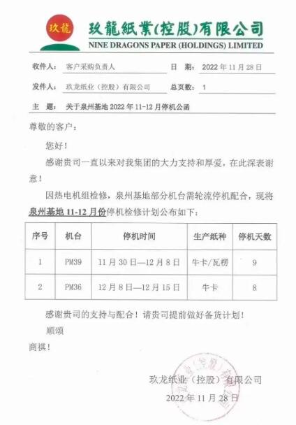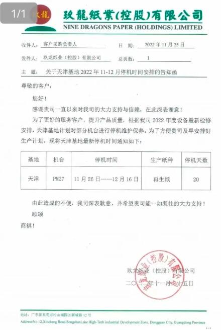 11月25日和28日,玖龍紙業天津、泉州兩大基地相繼發布停機公函,