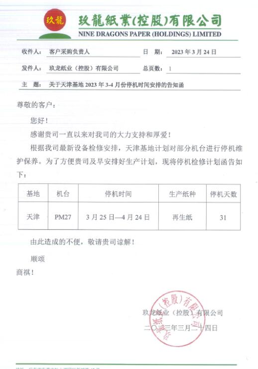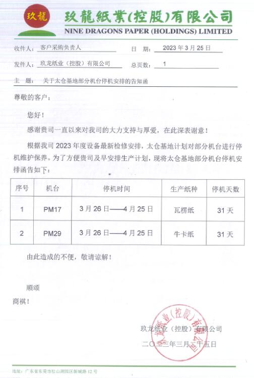3月24日,玖龍紙業發布關于東莞基地2023年3-4月停機時間安排的告知函。
