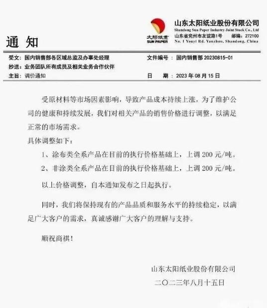 山東太陽紙業(yè)股份有限公司:受原材料等市場因素影響,導(dǎo)致產(chǎn)品成本持續(xù)上漲,自通知發(fā)布之日起:1、涂布類全系產(chǎn)品在目前的執(zhí)行價格基礎(chǔ)上,上調(diào)200元/噸;2、非涂類全系產(chǎn)品在目前的執(zhí)行價格基礎(chǔ)上,上調(diào)200元/噸。