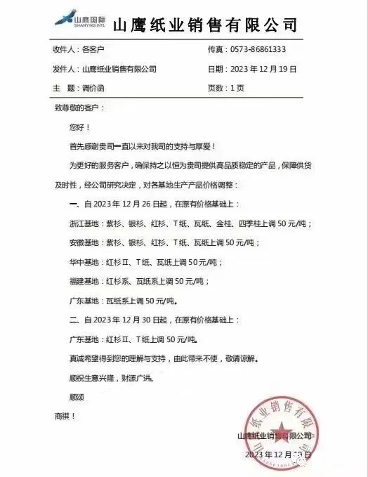 12月19日,山鷹國際宣布,自12月26日起,浙江、安徽、華中、福建、廣東五大基地上漲50元/噸,主要涉及箱板紙、瓦楞紙。其中,廣東基地12月30日將繼續保持漲勢。