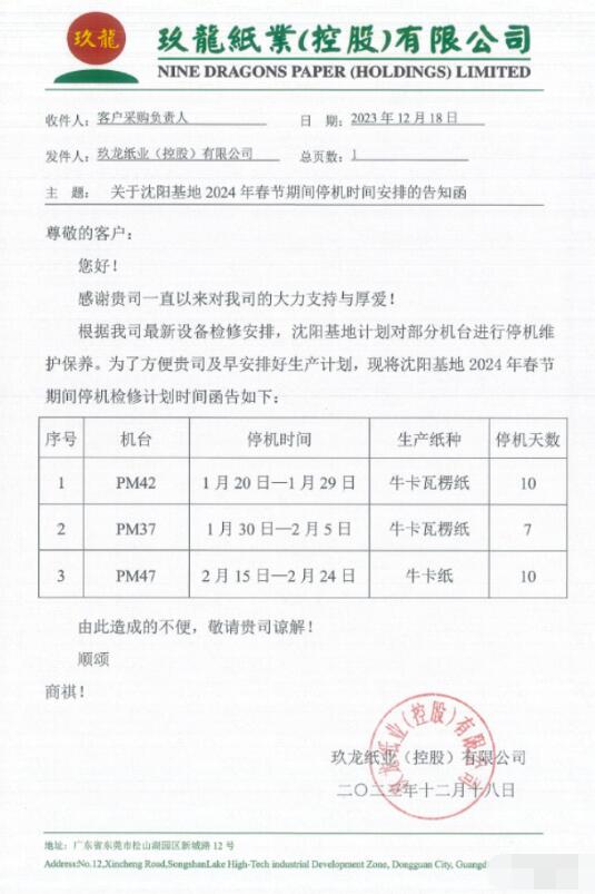 12月18日,玖龍紙業發布停機檢修通知,天津、河北唐山和遼寧沈陽基地全部紙機將在2024年1月20日至3月14日期間輪停7-11天,按照設計產能計算,預計將減產12.5萬噸箱板瓦楞紙和1.6萬噸灰底白板紙。