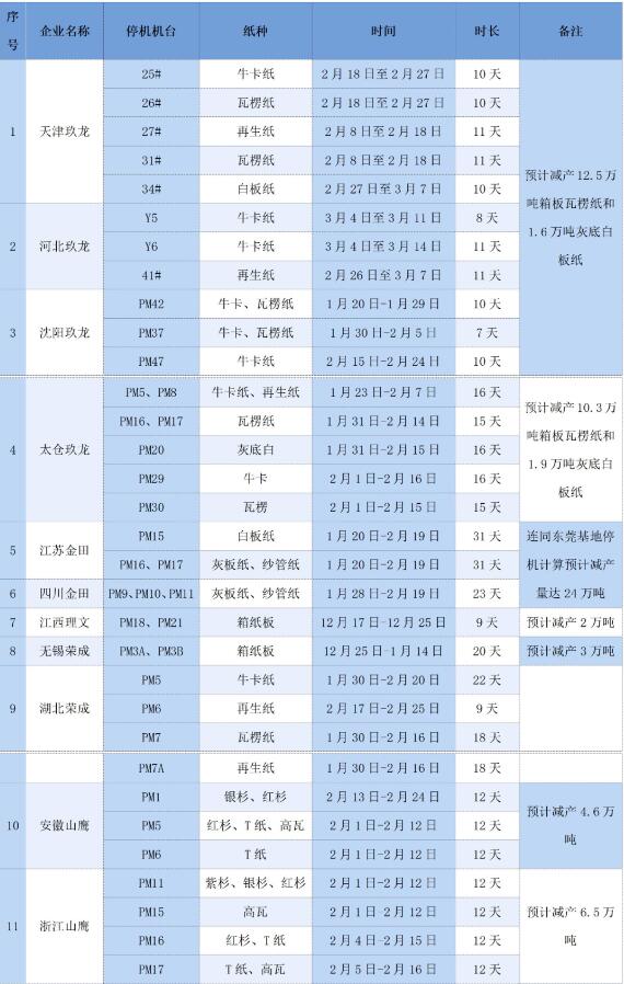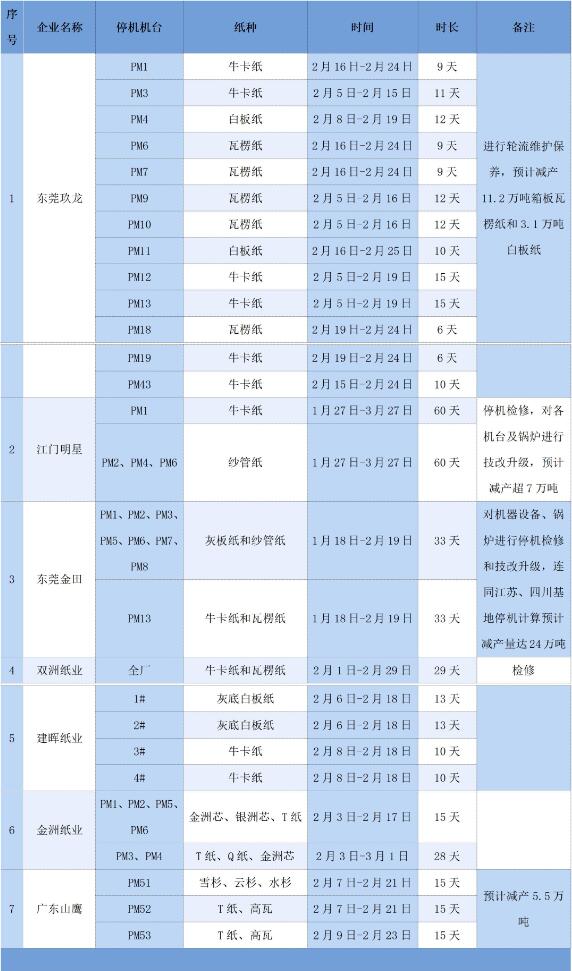 近段時間以來,關于造紙企業的春節停機通知陸續傳來。2024年1月9日,據不完全統計,目前已有20多家紙廠公開發布了停機檢修計劃,停機時間集中于1月底-3月中旬,單臺紙機的停機時間最長達60天。