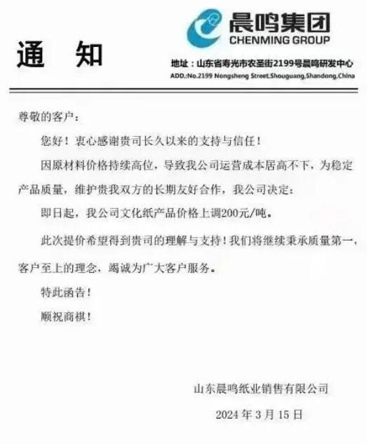 即日起,我公司文化紙產(chǎn)品價格上調(diào)200元/噸。
