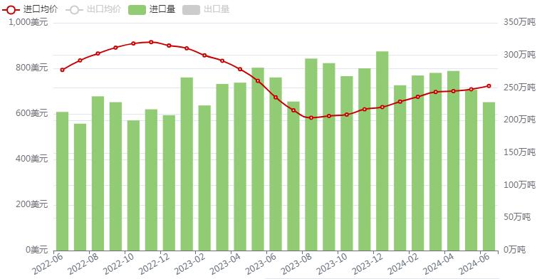 闊葉漿2023年進口量為1635.31萬噸,較2022年的1279.63萬噸,同比增長27.80,進口均價為610.47美元/噸,較2022年的703.52美元/噸,下降13.23%。2024年1-6月份,進口量為778.82萬噸,進口均價為623.75美元/噸。