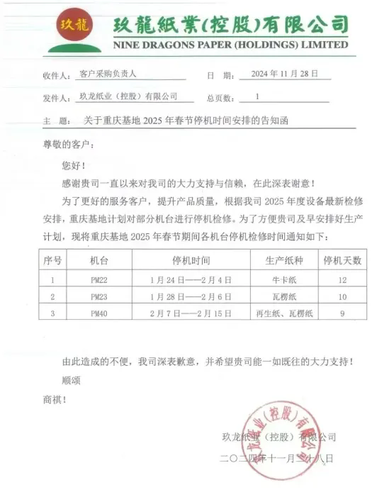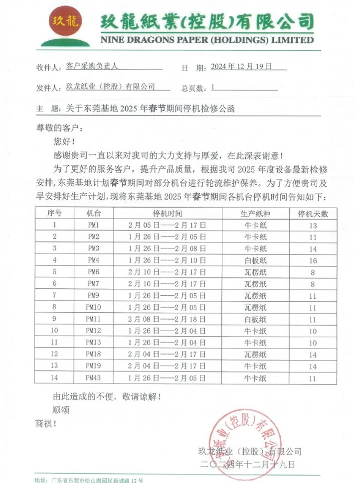 12月19日,東莞玖龍發布了2025年春節停機檢修計劃,該基地14臺紙機將在2025年1月底至2月中旬期間輪停8-16天,預計減產17.5萬噸包裝紙,其中包括13.8萬噸箱板瓦楞紙和3.7萬噸白板紙。