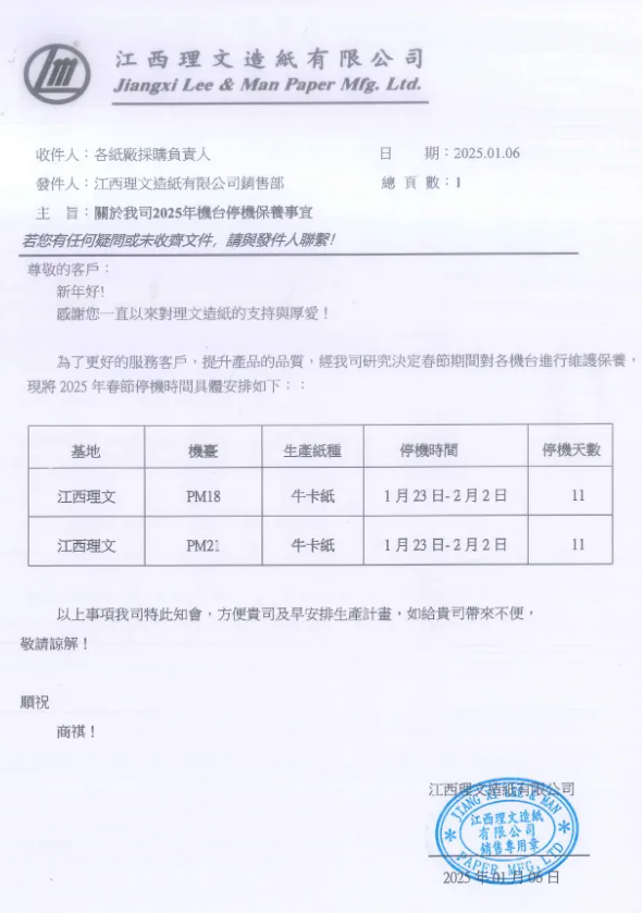 江西理文的兩臺紙機計劃在1月23日至2月2日停機11天。