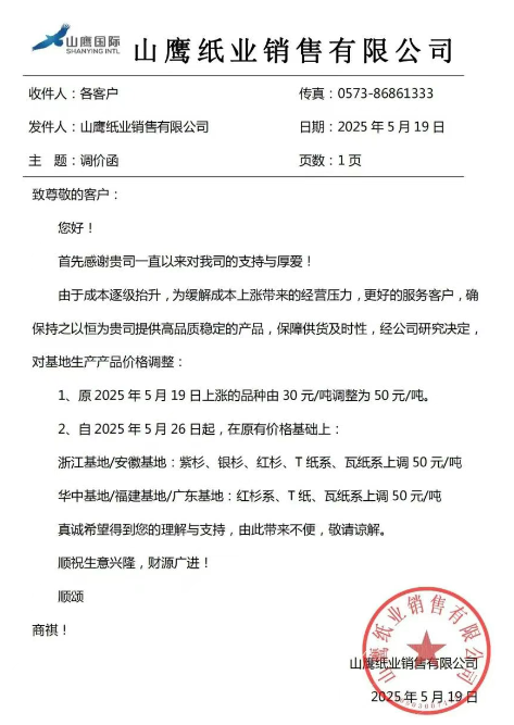 山鷹紙業:1、原2025年5月19日上漲的品種由30元/噸調整為50元/噸。2、自2025年5月26日起,在原有價格基礎上:浙江基地/安徽基地:紫杉、銀杉、紅杉、T紙系、瓦紙系上調50元/噸。華中基地/福建基地/廣東基地:紅杉系、T紙、瓦紙系上調50元/噸。