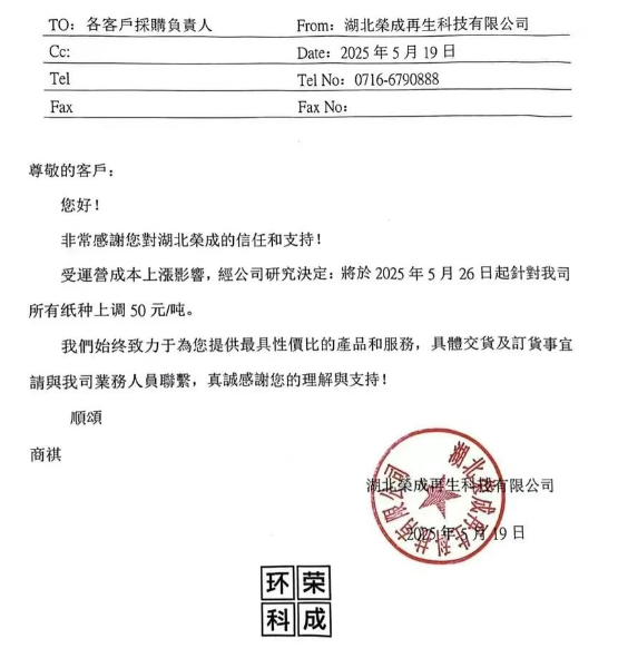 湖北榮成再生科技:自2025年5月26日起,針對(duì)所有紙種上調(diào)50元/噸。