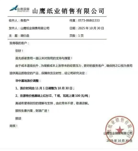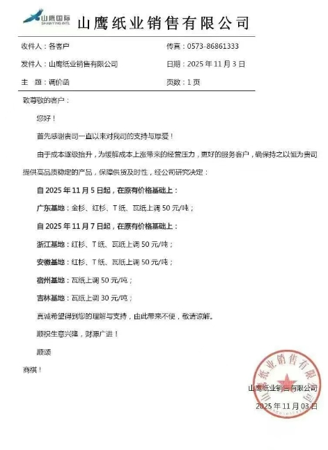11月3日,山鷹紙業發布了最新調價函,自11月5日起,廣東基地的金杉、紅杉、T紙、瓦紙價格上調50元/噸。自11月7日起,浙江基地的紅杉、T紙、瓦紙上調50元/噸,安徽基地的紅杉、T紙、瓦紙上調50元/噸,宿州基地的瓦紙上調50元/噸,吉林基地的瓦紙上調30元/噸。