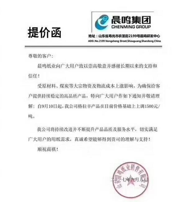 晨鳴紙業漲價函(2017-09-11)